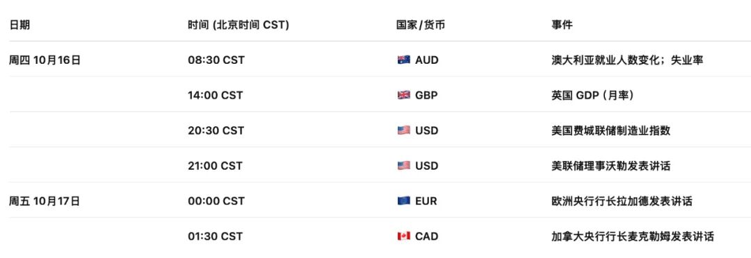 10月16日(星期四)北京时间14:00,市场开盘英国8月GDP月率数据。需要关注的是,美国将于今天北京时间20:30公布费城联储制造业指数,美联储理事沃勒即将于21:00发表的讲话将成为市场关注的焦点。