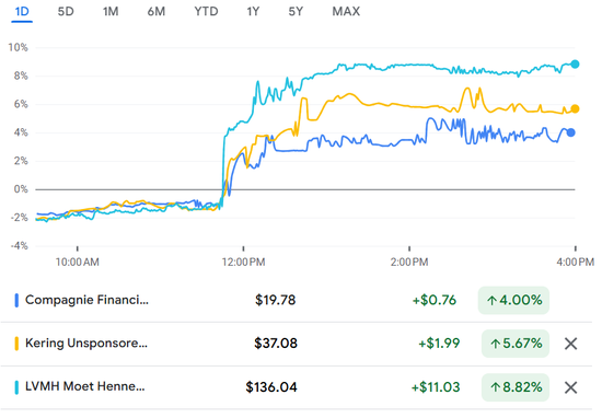 财报公布后,LVMH酩悦轩尼诗集团ADR股价上涨逾8%。 GUCCI旗下ADR旗下的开云集团上涨5.67%,爱马仕国际和卡地亚旗下的历峰集团也上涨4%,因为LVMH酩悦轩尼诗集团被普遍认为是行业的龙头。