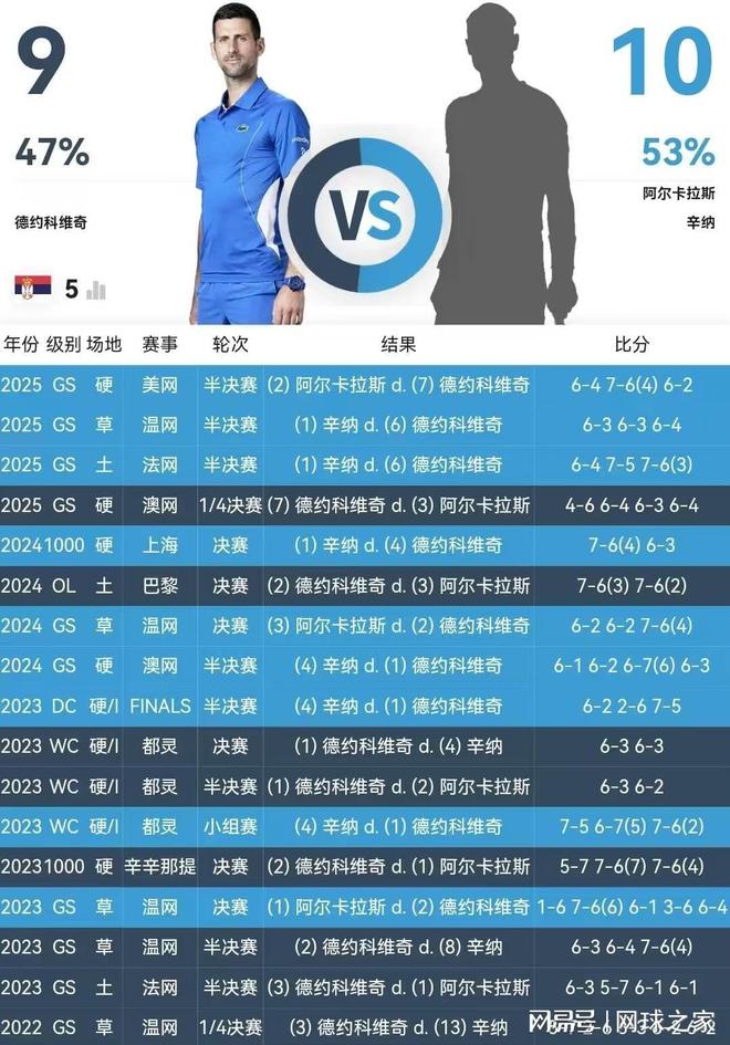 下个月澳大利亚网球公开赛即将举行,十届赛事冠军德约科维奇自然会将赛季重点放在这项大满贯上,这是最好的。于是,他在澳网之前再次报名参加250场热身赛。德约科维奇如果想夺冠,无论如何都不能绕开阿卡和辛纳。那么,历史上德约科维奇两人硬地交锋的战绩如何呢?首先,让我们看看与罪人的战斗。德约科维奇与辛纳的首场硬地比赛是在去年年终总决赛的小组赛中。当时在本地比赛的辛纳击败对手,最终将德约科维奇逼入险些无缘小组出线的境地。幸运的是,辛纳当时还是相当专业的,在最后一轮没有选择放弃,让德约科维奇被淘汰出局。淘汰赛中,双方再次相遇,这次是决赛。回来后回到家,德约科维奇转身成功反击。赛后颁奖典礼上,亚军在中间,冠军在旁边,成为全场热议的话题。上赛季,辛纳和德约科维奇在大满贯硬地赛事中首次相遇。此次澳网半决赛,辛纳首次打进澳网半决赛,而德约科维奇则打进了他最熟悉的一轮——直到打进澳网半决赛,他在上届冠军中都没有输过。但记录就是用来打破的。辛纳整场比赛没有送出破发点,最终赢得了这场重要的比赛。去年上海大师赛决赛,双方再次相遇。尽管德约科维奇往届赛事的胜率相当高,但在实力强劲的对手面前,他还是不得不输掉比赛。目前两人硬地对决,辛纳3-1领先德约科维奇。冷杉阿卡尔和德约科维奇之间的首次硬地对抗发生在2023年辛辛那提大师赛决赛中。其间,两人在温网之后连续决赛再次相遇。德约科维奇在温布尔登中心球场的十年不败纪录被对手终结。复仇之火熊熊燃烧。获胜后,他撕下球衣表达喜悦之情。当年的年终总决赛半决赛,逃过一劫的德约科维奇面对赛会经验尚浅的西班牙人,直落两盘获胜。去年澳网四分之一决赛,一个是志在实现大满贯,另一个是捍卫墨尔本之王的荣耀。德约科维奇在先丢一盘后最终拿下余下比赛。目前,两人在硬地球场上以3-0领先阿卡。从交锋记录来看,德约科维奇在硬地球场上并不惧怕阿卡尔,但他注定会与两人之一处于同一个半区。如果我们能赢得冠军那就太好了与抽签也有重要关系,让我们拭目以待吧! (来源:网球之家 作者:罗成启业)
