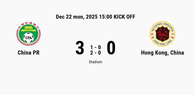 体坛周报全媒体原创12月22日,U15东亚杯第三轮比赛中,中国队对阵中国香港队。最终,凭借盛晨曦、柯博文等人的进球,中国队以3-0获胜,以1胜1平积4分的成绩获得小组第三。本场比赛之前,由于韩国队战胜了日本队,中国队如果不想垫底,此役必须全取3分。第7分钟,徐钟琪禁区外埋没防守球员,随后完成远射。第16分钟,对手禁区内任意球,陈成云主罚,但随后裁判吹响示意越位。第29分钟,中国U15队取得领先。李宇轩左路传中,盛晨曦高高跃起头球破门。两队互攻互守后,中国队以1-1结束上半场。0领先。下半场一开始,中国U15队利用角球机会取得进球。但主裁示意越位,进球无效。第45分钟,中国U15队继续进攻。潘超伟在禁区内冷静掩埋防守球员,射门远角。球没有击中门柱。 2分钟后,江乐右路冲入,过掉两人后射门无力。防守球员挡住球。第51分钟,中国U15队再进一球。盛晨曦斜传球找到柯博文。柯鲍文铲倒防守球员,左脚低射远角。第66分钟,对方10号于景珏在禁区线附近用大腿停球,随后转身打门高出。第67分钟,刘宇洋小角度左脚大力射门近角,但球被对方门将扑出。比赛补时阶段,中国U15队利用角球机会再进一球。最终,中国U15队以3-0获胜,以1胜1平积4分的成绩获得小组第三。中国U15首发名单:12-陈成云、5-吉正浩、8-许忠奇、10-苏子怡、11-薄华军、17-彭曦然、18-姜乐尚、7-郑康进、14-李宇轩、16-陈博文尼亚、16-陈恩、2-杨辰硕、3-李袁熙、4-杨意环、6-潘超伟、13-高泽恩、15-吴必乐、20-朱家骏、19-刘宇洋 香港U15首发阵容:18-罗剑峰、17-富昂、3-吴日朗、2-李晨曦、11-谢耀南、8-李成军、 14-谭浩然、10-于景珏、16-刘浩、9-黄顺 香港U15替补:12-张志轩、7-黄快军、1-熊15-林5、贝亚菲 20-冯天南、6-包学贤、13-张金洛、19-陆哲阳
